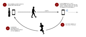 You are now all set. You will be receiving an exit alert within 60 seconds after you walk out of umbrella’s range (approx. 30 ft). Once you receive a "Connection is lost" alert notification, you will need to return back to umbrella to reset the alarm. When you get close within < 2ft. of your umbrella, your phone will automatically reconnect within 30 seconds and send you a new activation alert.