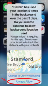 Periodically, the app will run a quick location update to the phone. This action will keep the app active while in the background and confirm if there is a nearby active sensor/umbrella. Selecting "Always Allow" will permit the app to connect automatically whenever you pick up your umbrella, without the need to turn the system on manually (similar to how your phone will auto-sync to your car when you turn on the engine).
